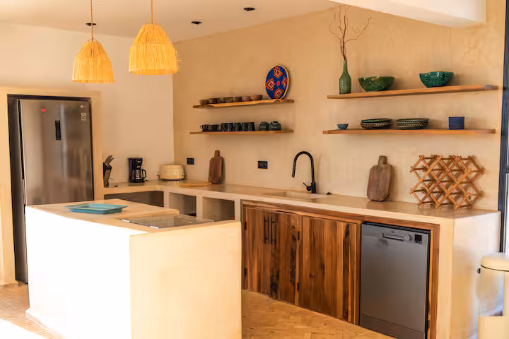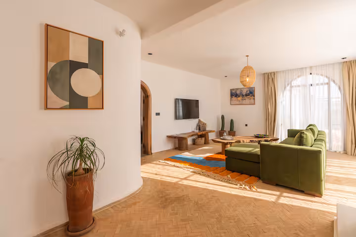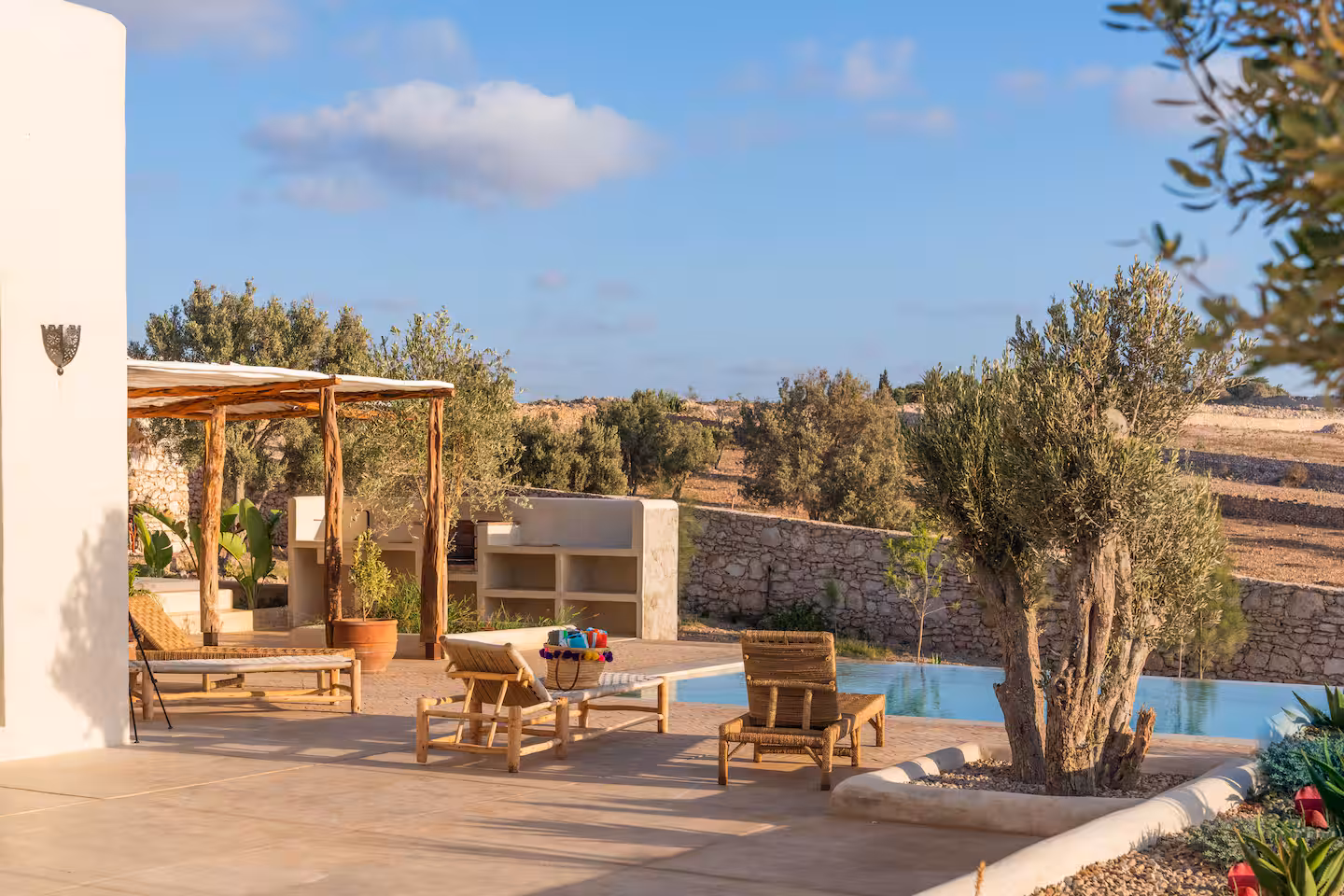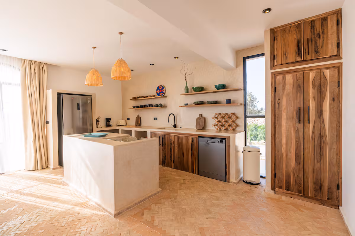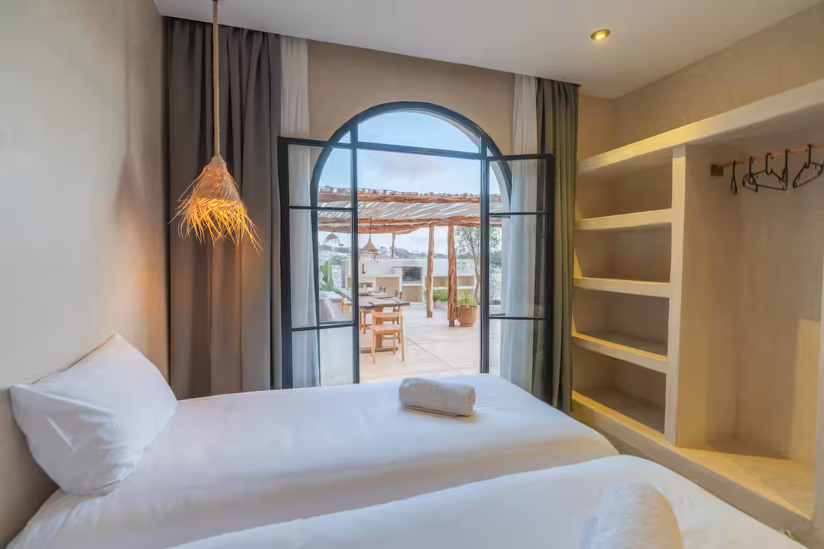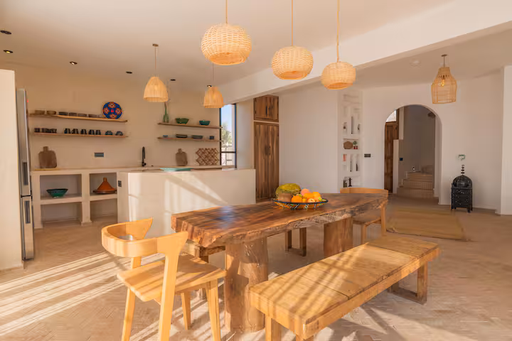 The modern architecture of the villa full of light, peaceful sounds, local colours and details plays with contrasts: traditional carpentry, tadelack, bijmat and minimalist decoration.